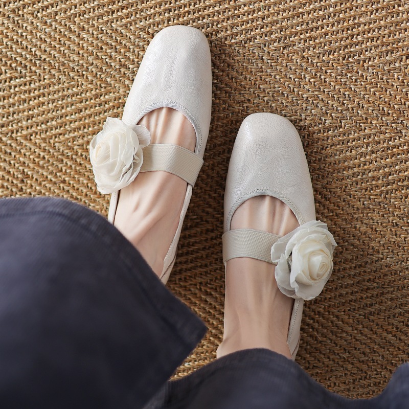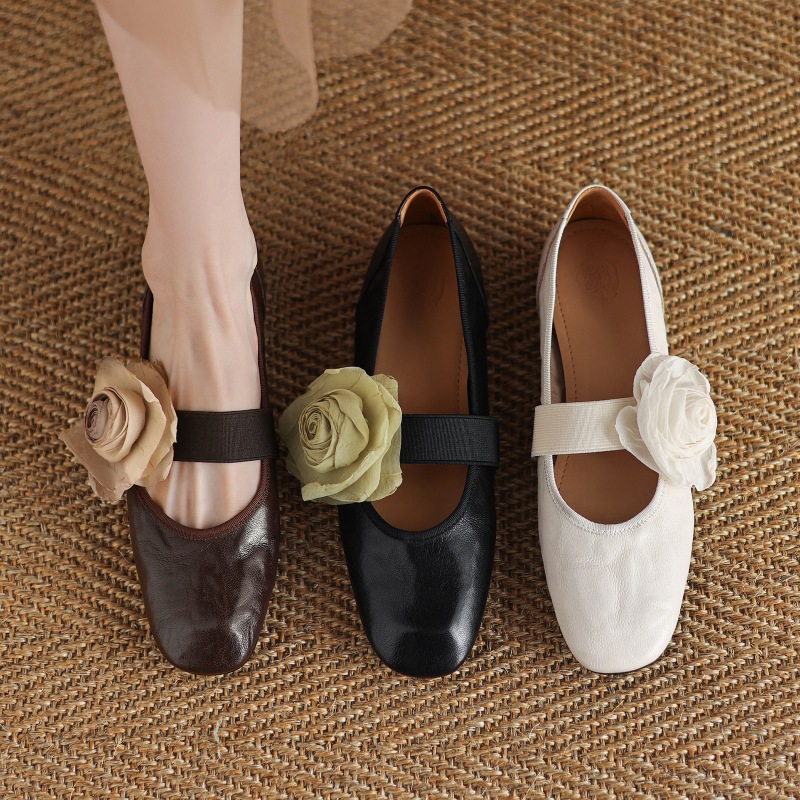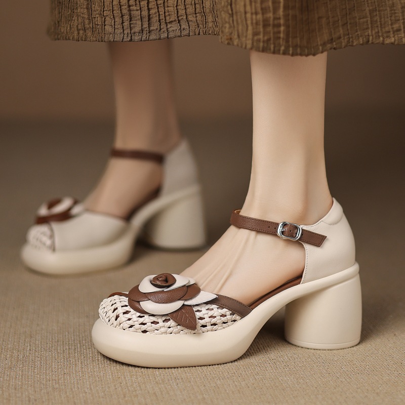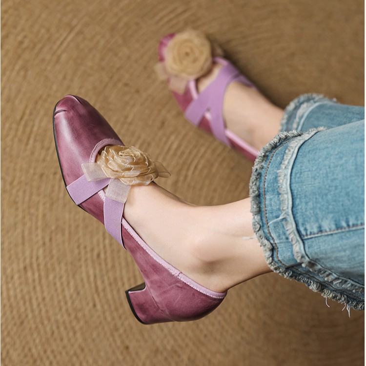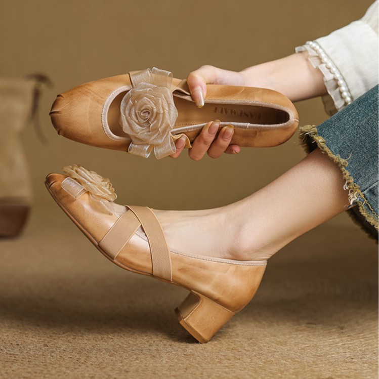 Fairy Style Top Layer Cowhide Flower Cross Belt Color-polishing French Style Spring and Autumn All-match Mid-heel Single-layer Shoes Women's Chunky Heel