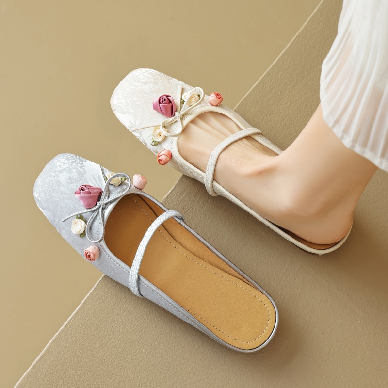 Summer Flower Bow End Baotou Empty Half Slippers for Commuting Silver Outer Wear Flat Mueller Shoes 3340 Size