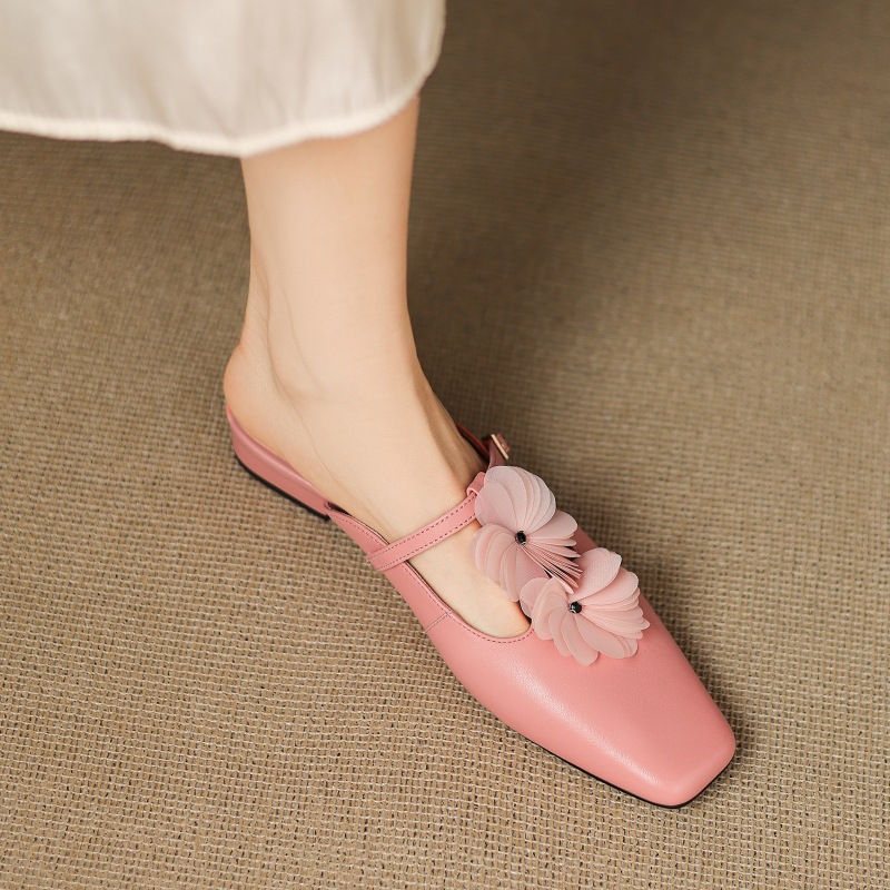 2025 Summer Cowhide Flower Empty Half Slippers Fashion Casual Flat Mule Shoes 4041 plus size Women's Shoes