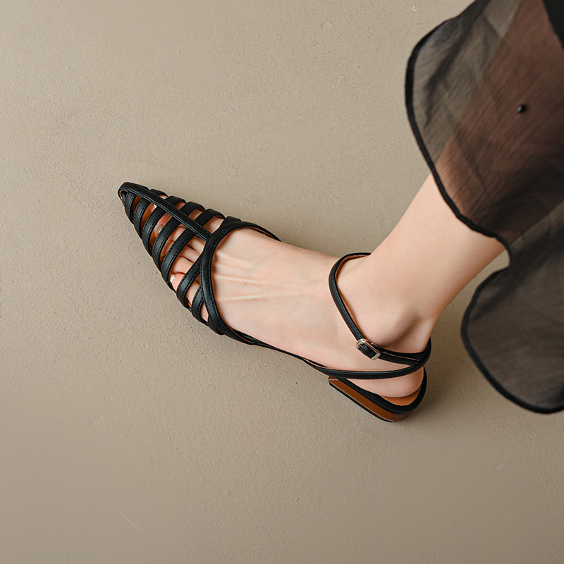 summer cowhide pointed hollow-out flat shoes with buckle breathable low heel Roman sandals for women 3340 plus size