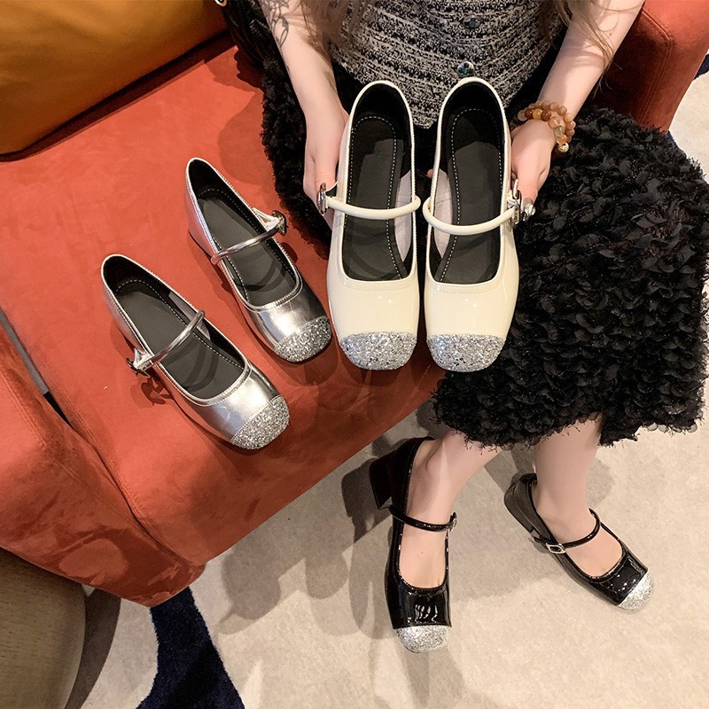 silver Mary Jane Shoes Women's Autumn New Fashion Banquet Shoes Toe Thick Heel Versatile High Heels